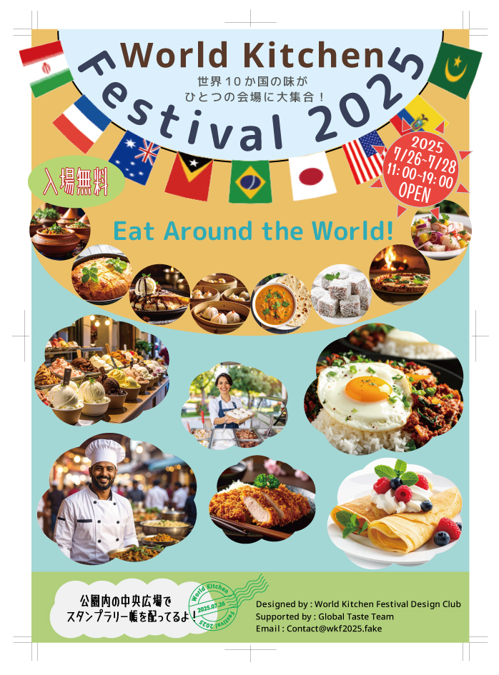 「World Kitchen Festival 2025」というテーマでイベントの主催者様よりご依頼があり、楽しくPOPなイメージでチラシを作成したいとのご要望があり作成したもの(架空イベント)です。